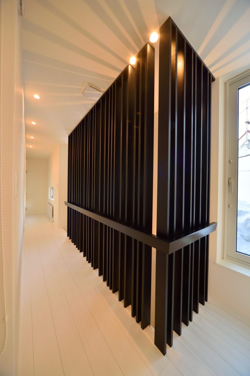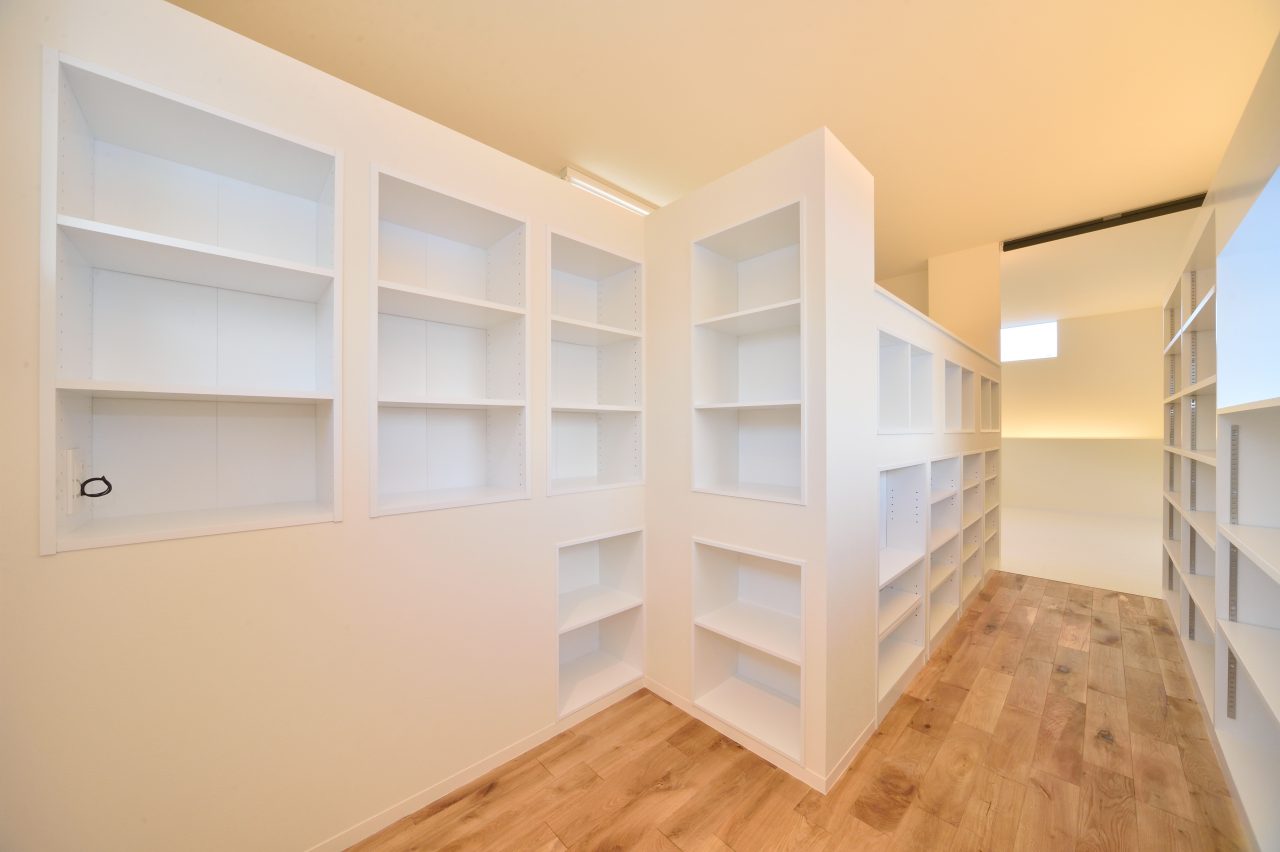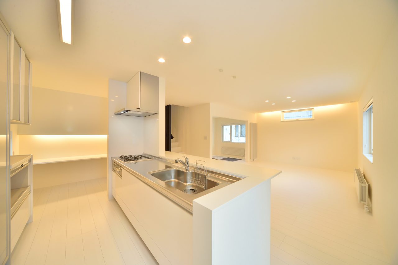 2016 設計・施工/(株)創樹 y モノトーンの美しい空間が好きなお施主様。 所持していたカラーボックスを埋め込んだり 旦那さまのアジトも楽しんで設計できました。 間接照明が映える白く美しいシンプルな住宅です。