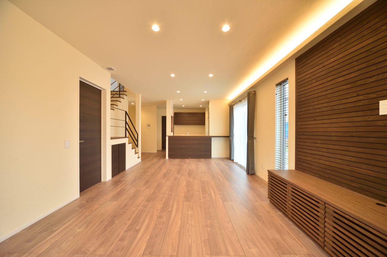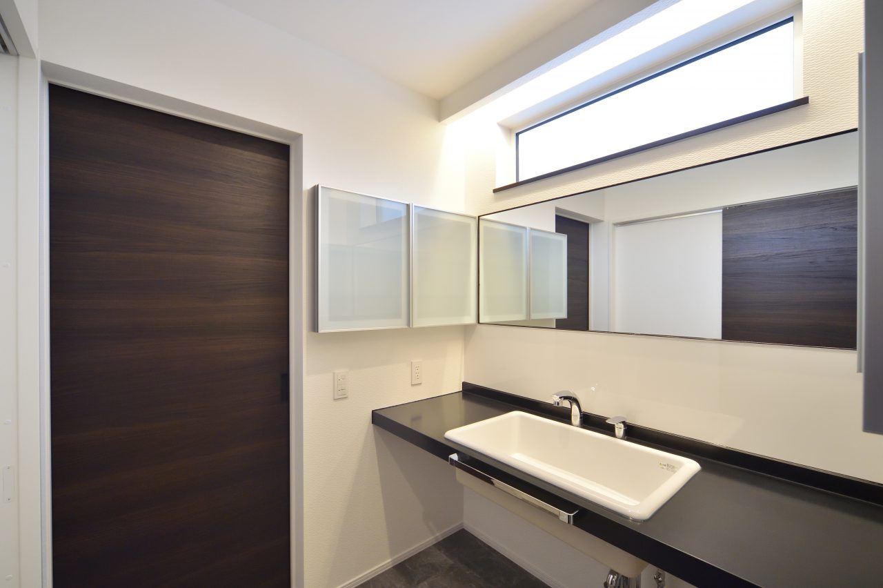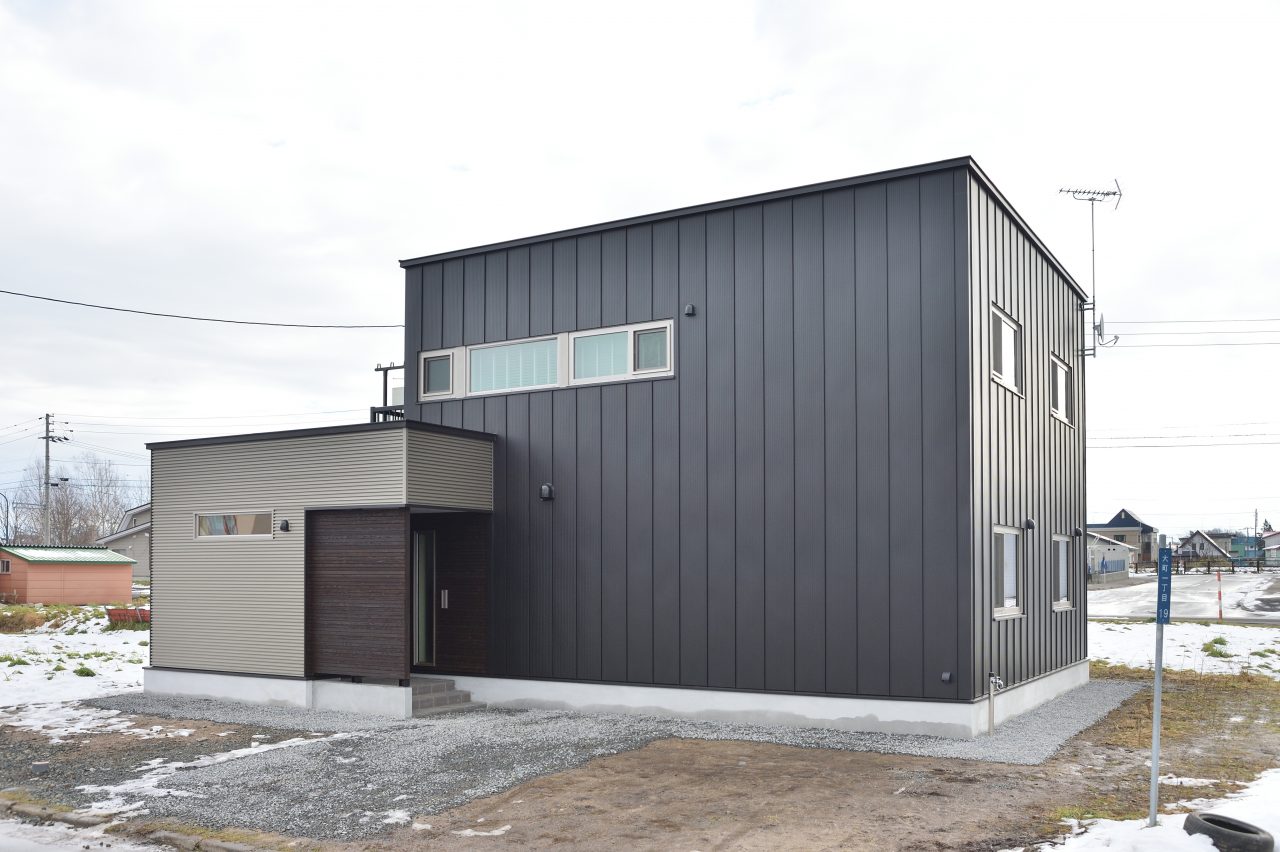 正面からの長尺板金がシャープに見え、モクと珪藻土と