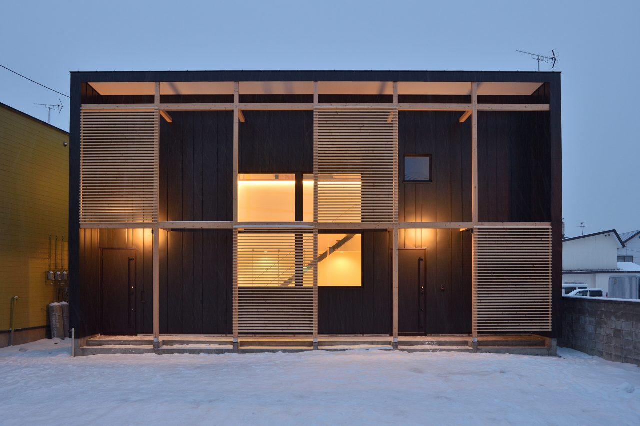 ガルバリウム鋼板と木が内部から漏れる光で引き立つ二世帯住宅