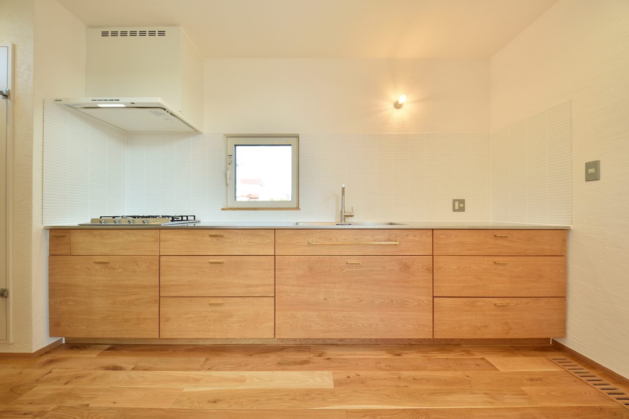 フルオーダーのキッチン、楢の無垢と白で纏まったデザイン