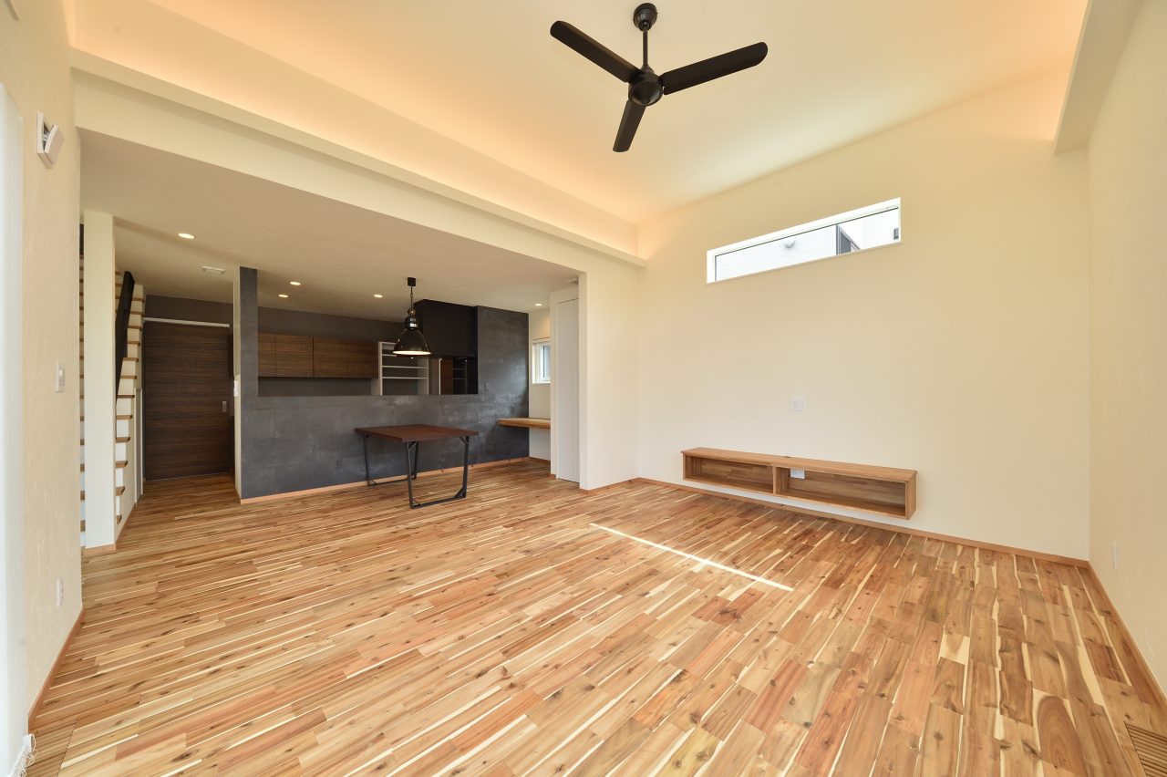 天井高さ3.2mのリビング、創樹のオリジナルダイニングテーブル