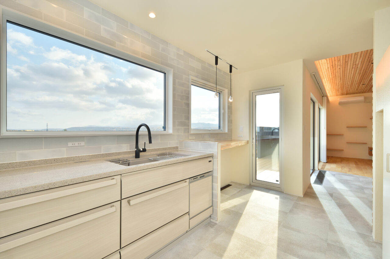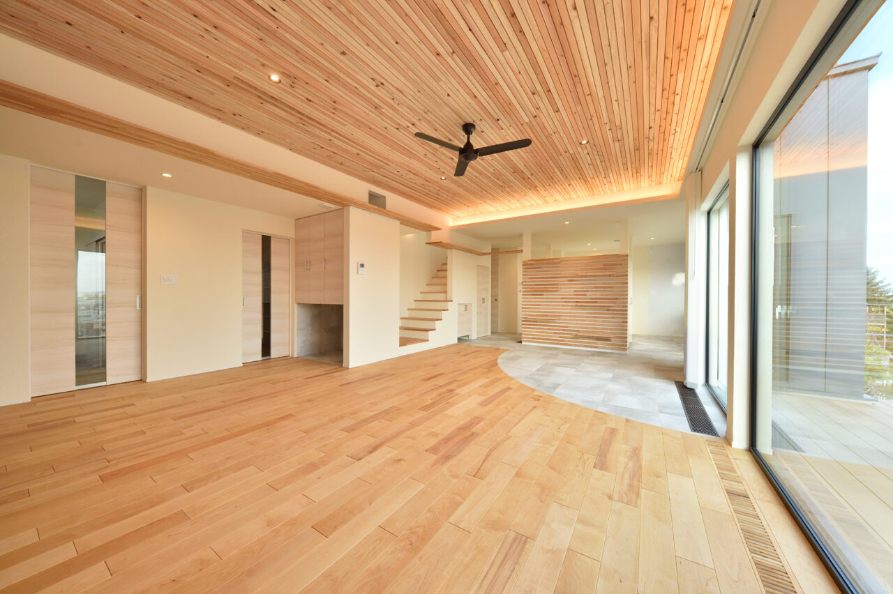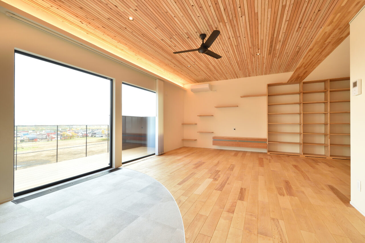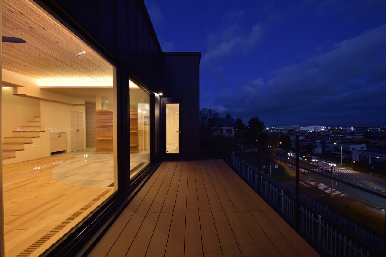 お酒を飲みながらここの景色を楽しみたいとの要望でリビングからフラットに旭川を見渡せる