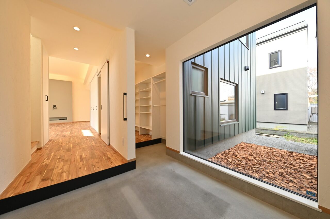 玄関からのFIX窓は譲れない奥さんの要望でした。来春植樹して玄関・小上り和室