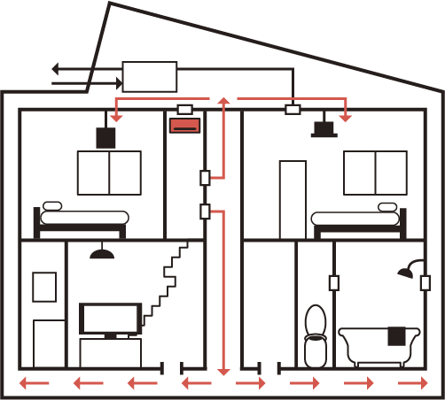 エアコンでOK - 部屋ごと必要だったエアコンも一家に1台で大丈夫。 一台で家全部の温度を管理するので低コスト。どの部屋もほぼ同じ温度を保ちます。